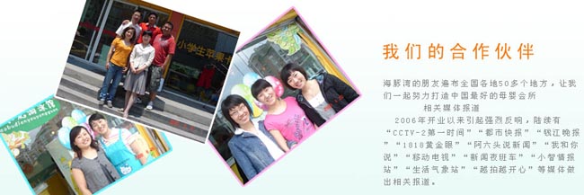 06年杭州第一家兒童專業(yè)理發(fā)服務(wù)機(jī)構(gòu)開張營(yíng)業(yè),經(jīng)過(guò)4年的發(fā)展成為杭州嬰幼兒服務(wù)最大最專業(yè)連鎖機(jī)構(gòu)之一,迄今為止已經(jīng)在全國(guó)各地?fù)碛?0多家合作店,第一家引進(jìn)來(lái)自太空的水處理系統(tǒng)--美國(guó)中央軟水處理系統(tǒng),第一家引進(jìn)開發(fā)了適合1到6歲寶寶的幼兒游泳項(xiàng)目,第一家擁有正規(guī)游泳師證書的嬰兒游泳館,第一家擁有嬰兒沖浪游泳的游泳館,第一家使用恒溫設(shè)備的游泳館。經(jīng)過(guò)幾年的發(fā)展,讓我們更懂得珍惜和感恩,愛孩子像愛自己的寶貝!