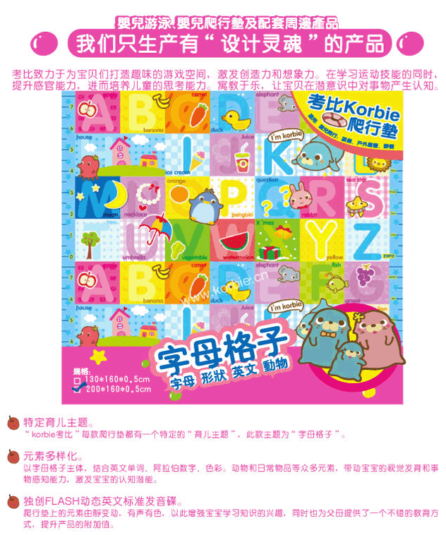 “考比Korbie”嬰兒爬行墊,是杭州杰弗瑞嬰童用品有限公司旗下的主打品牌產(chǎn)品。Korbie,源自德文“korb”,是“籃子”的意思?急菿orbie,給爸爸媽媽一個(gè)放心的“籃子”,為寶寶的成長(zhǎng)創(chuàng)造一個(gè)安全、舒適和快樂(lè)的小天地。
