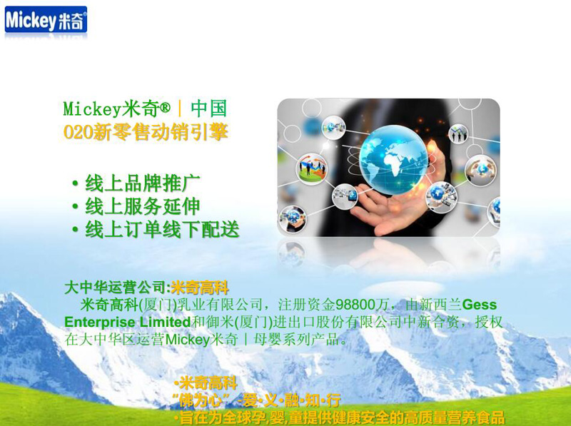 米奇高科(廈門)乳業(yè)有限公司注冊資金98800萬,由新西蘭Gess Enterprise Limited和御米(廈門)進出口股份有限公司中外合資,授權(quán)在大中華區(qū)運營Mickey米奇母嬰系列產(chǎn)品。