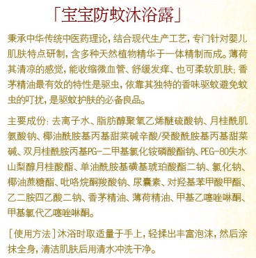 潤(rùn)本草本防蚊沐浴露秉承中華傳統(tǒng)中醫(yī)藥理論,結(jié)合現(xiàn)代生產(chǎn)工藝,專(zhuān)門(mén)針對(duì)嬰兒肌膚特點(diǎn)研制,含多種天然植物精華于一體,精制而成。薄荷其清涼的感覺(jué),能收縮微血管、舒緩發(fā)癢、也可柔軟肌膚;香茅精油有效特性是驅(qū)蟲(chóng),依靠其獨(dú)特的香味驅(qū)蚊,避免蚊蟲(chóng)的叮咬,是驅(qū)蚊護(hù)膚的必備良品。