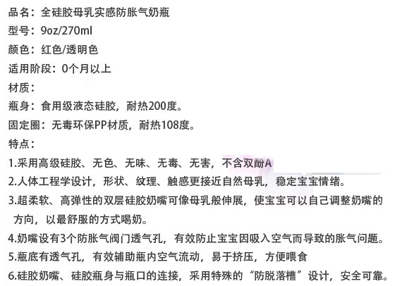 硅膠很柔軟,不用奶瓶刷用手也可以刷到奶瓶的各個角落,容易清洗。寶寶吸奶時,奶瓶會隨著奶水的減少而自動收縮,始終保持著瓶身內(nèi)外氣壓一致,避免寶寶吸入過多的空氣而導致嗆奶、腹脹等不適,有效解決喂奶時脹氣的煩惱,從而達到自動呼吸的功能。