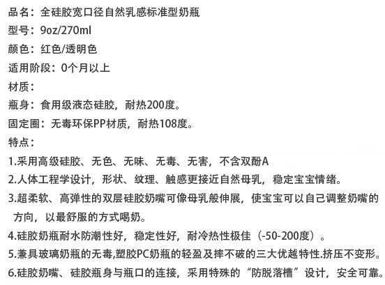 硅膠很柔軟,不用奶瓶刷用手也可以刷到奶瓶的各個(gè)角落,容易清洗。寶寶吸奶時(shí),奶瓶會(huì)隨著奶水的減少而自動(dòng)收縮,始終保持著瓶身內(nèi)外氣壓一致,避免寶寶吸入過多的空氣而導(dǎo)致嗆奶、腹脹等不適,有效解決喂奶時(shí)脹氣的煩惱,從而達(dá)到自動(dòng)呼吸的功能。