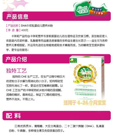 卡咪呢有機(jī)米粉系列是專為中國寶寶設(shè)計(jì)的營養(yǎng)輔食,選用有機(jī)大米,科學(xué)搭配維生素AD等維生素,還特別添加;撬、DHA、AA等有助智力發(fā)育的營養(yǎng)成分,富含15種營養(yǎng)素。現(xiàn)上?ㄟ淠啬笅胗闷酚邢薰久嫦蛉珖瞻资袌(chǎng)區(qū)域誠招卡咪呢有機(jī)米粉代理商。