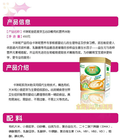 卡咪呢有機米粉系列是專為中國寶寶設(shè)計的營養(yǎng)輔食,選用有機大米,科學(xué)搭配維生素AD等維生素,還特別添加;撬、DHA、AA等有助智力發(fā)育的營養(yǎng)成分,富含15種營養(yǎng)素。現(xiàn)上?ㄟ淠啬笅胗闷酚邢薰久嫦蛉珖瞻资袌鰠^(qū)域誠招卡咪呢有機米粉代理商。