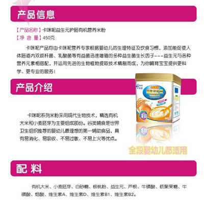 卡咪呢有機米粉系列是專為中國寶寶設(shè)計的營養(yǎng)輔食,選用有機大米,科學(xué)搭配維生素AD等維生素,還特別添加;撬、DHA、AA等有助智力發(fā)育的營養(yǎng)成分,富含15種營養(yǎng)素,F(xiàn)上?ㄟ淠啬笅胗闷酚邢薰久嫦蛉珖瞻资袌鰠^(qū)域誠招卡咪呢有機米粉代理商。