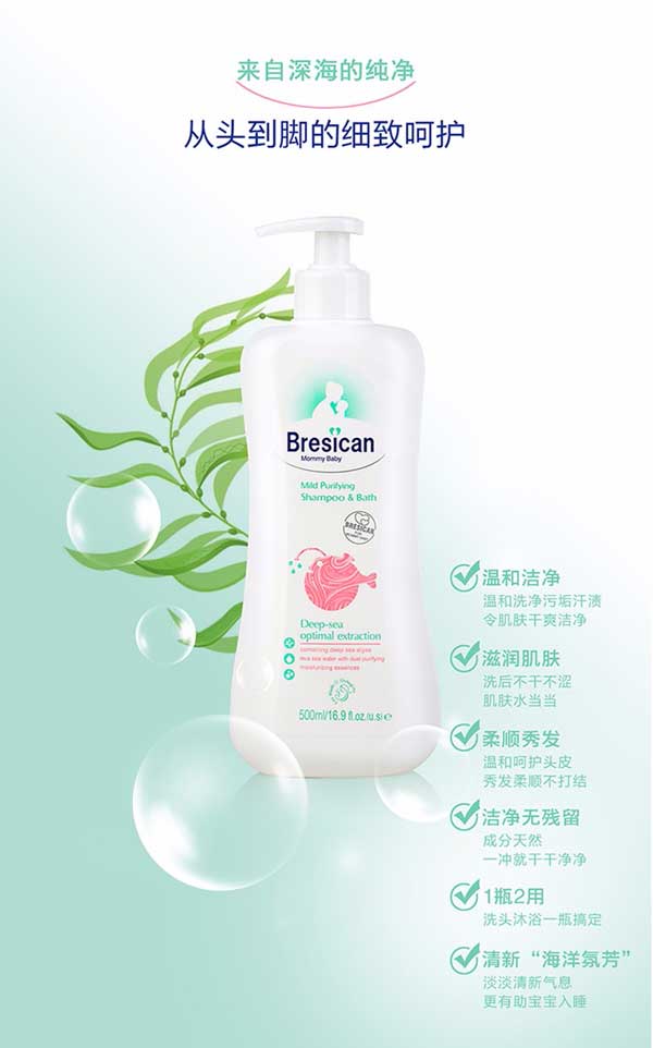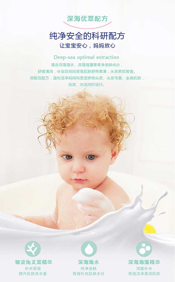 貝施康柔凈洗發(fā)沐浴2合1是 “深海優(yōu)萃”系列的王牌產(chǎn)品,根據(jù)yinge特殊肌膚PH特點研制,從深海中萃取自然純凈成分,配方做到純正安全,讓媽媽心安!