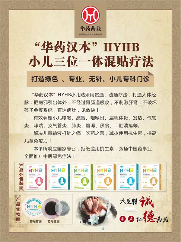 “華藥漢本”HYHB小兒貼采用貫通、疏通療法,打通人體經(jīng)脈,把病邪引出體外,不經(jīng)過胃腸道吸收,不刺激肝腎,不破壞孩子免疫系統(tǒng),直達(dá)病灶。安全調(diào)理小兒咳嗽、感冒、咽喉炎、扁桃體炎、發(fā)熱、氣管炎、哮踹、支氣管炎、肺炎、腹瀉、厭食、口腔潰瘍等。避免兒童輸液打針之痛,吃藥之苦,減少使用抗生素。