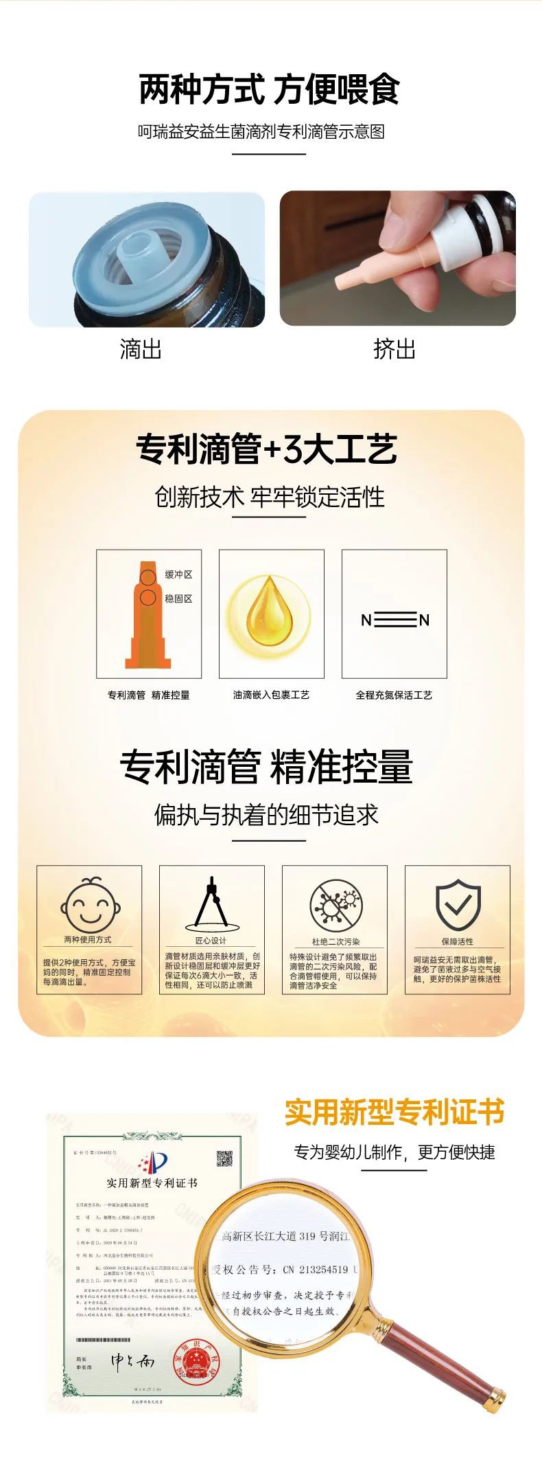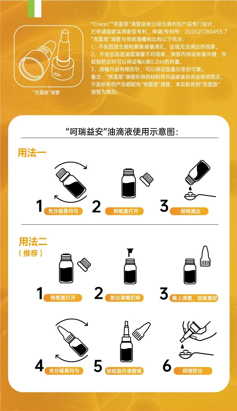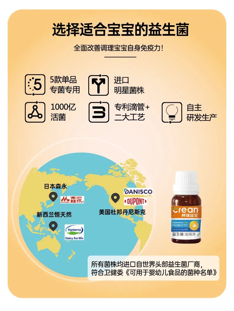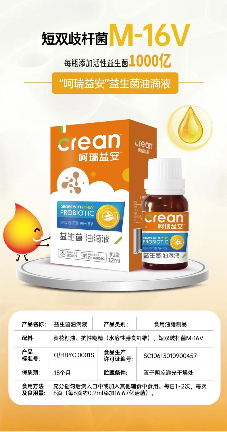 呵瑞益安短雙歧桿菌M-16V益生菌油滴液,采用進(jìn)口菌株,且選用菌株符合衛(wèi)健委【可用于yingye食品的菌種名單】。添加進(jìn)口原料,如瑞典AAK進(jìn)口油脂及進(jìn)口水溶性膳食纖維,安全配方,自主研發(fā)生產(chǎn),每瓶添加1000億活性益生菌,專利滴管,精準(zhǔn)控量,油滴嵌入包裹工藝+全程充氮;罟に嚕卫捂i定活性。