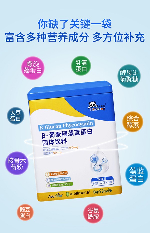 必慧龍β-葡聚糖藻藍蛋白,硬核雙保護,解鎖好體質(zhì)!含量高,添加量足,原廠專利原料認證授權(quán),富含多種營養(yǎng)成分,多方位全面補充!每袋添加美國專利酵母β-葡聚糖250mg,乳清蛋白200mg,藻藍蛋白60mg,螺旋藻蛋白200mg以及接骨木莓粉250mg,同時特別添加綜合酵素及多種維生素,一袋滿足每日保護力所需!不含防腐劑、人工色素、麩質(zhì),放心好選擇,給力助成長!