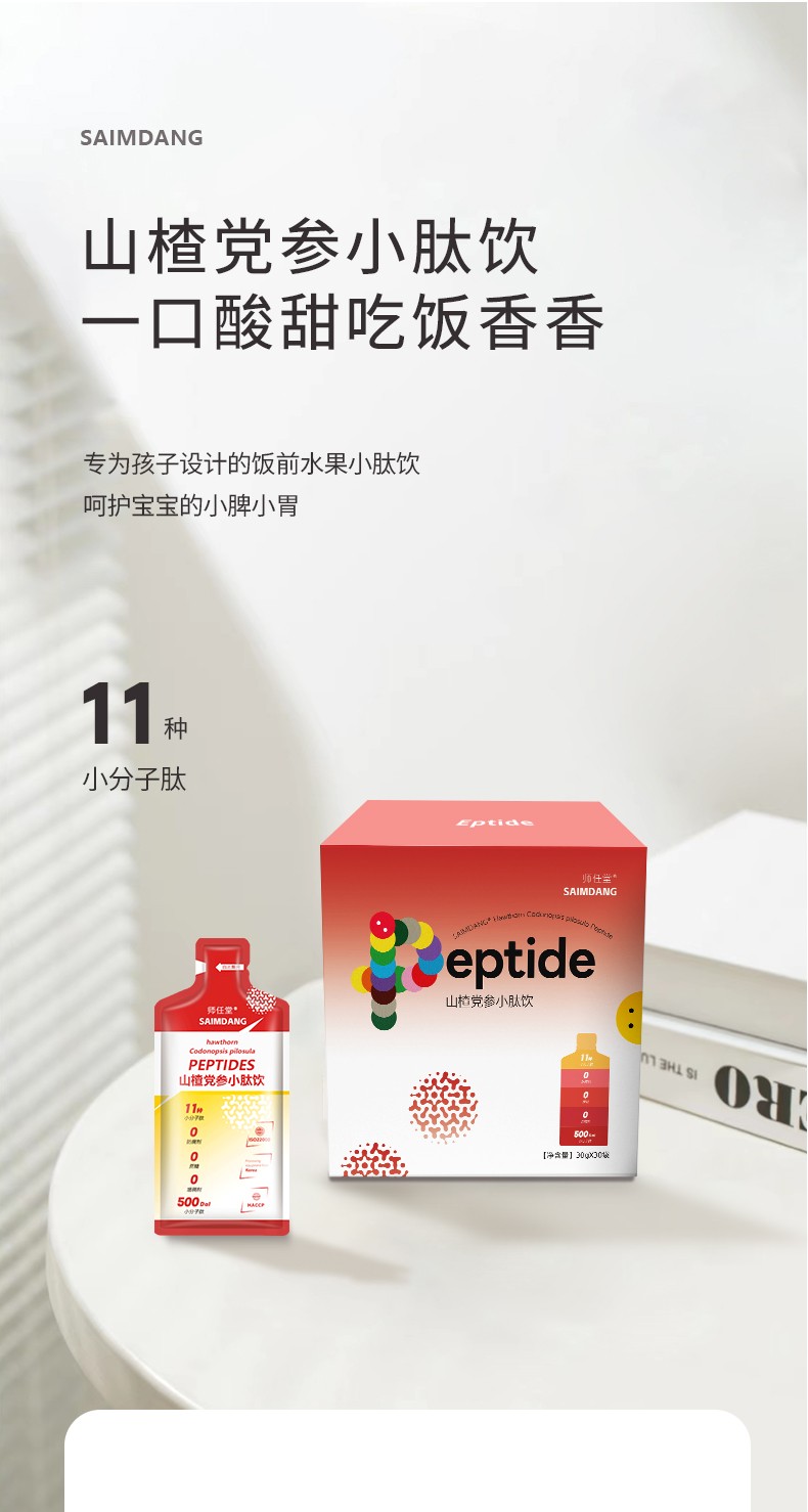 師任堂山楂黨參小肽飲,專為孩子設計的飯前水果小肽飲,脾胃好搭檔。靈感來自名方“四神湯”“四君子湯”,嚴選11種穿草本植物精華,黨參、雞內(nèi)金、山藥、白扁豆、茯苓、陳皮、薏苡仁、麥芽、白芷、萊菔子、沙棘等,呵護寶寶的小脾小胃。小分子肽,孩子更易吸收,不給腸胃加負擔。免煮泡,開袋即飲,不添加香精防腐劑,每一口都健康。