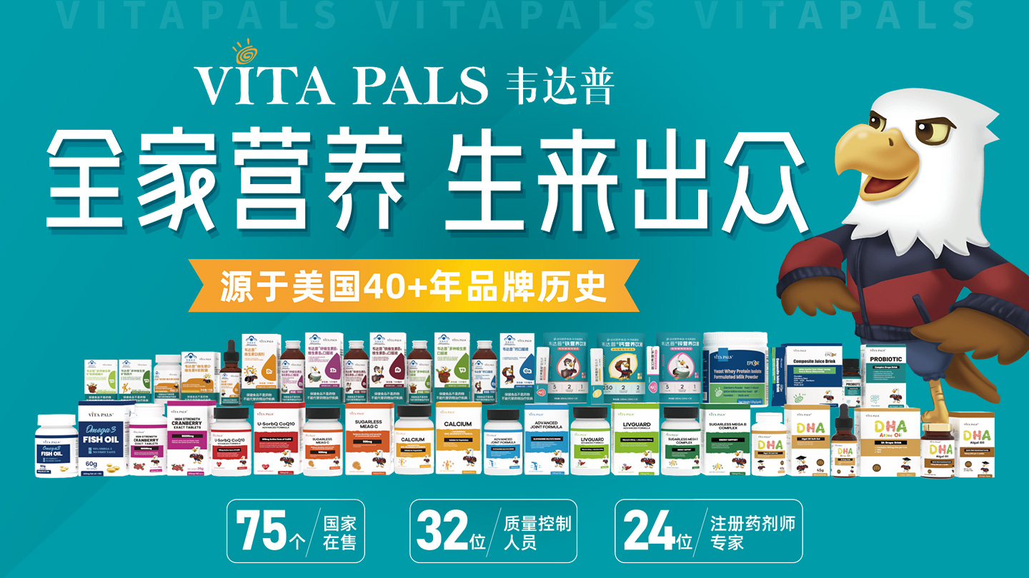 韋達(dá)普(VITA PALS)是來自美國原裝進口的營養(yǎng)健康品牌,工廠擁有美國FDA和cGMP的生產(chǎn)認(rèn)證。產(chǎn)品遠(yuǎn)銷北美、歐洲、亞洲、澳洲等75個國家和地區(qū)。2019年,青島宏寶生物科技有限公司正式與美國韋達(dá)普品牌全球運營總裁簽訂戰(zhàn)略合作協(xié)議,成為美國韋達(dá)普品牌中國獨家運營商。韋達(dá)普覆蓋多品類營養(yǎng)產(chǎn)品,包含免疫、維生素、心血管、消化類產(chǎn)品,為各類人群定制專屬產(chǎn)品。