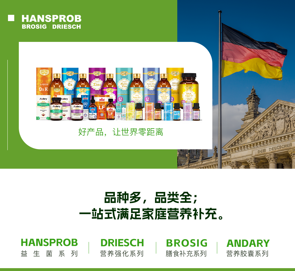 集團(tuán)旗下?lián)碛袣W盟品牌Hansprob(漢思鉑),以及Brosig和Driesch等眾多專業(yè)領(lǐng)域品牌。這些品牌均深耕于高端營養(yǎng)食品領(lǐng)域,以進(jìn)口優(yōu)質(zhì)德國營養(yǎng)食品為核心業(yè)務(wù)。秉承“好產(chǎn)品,世界零距離”的企業(yè)理念,公司致力于為全球?qū)殞毤八腥巳禾峁┳畎踩、最?yōu)質(zhì)的營養(yǎng)食品。