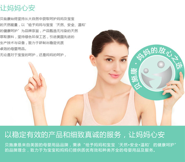 品牌理念:讓媽媽心安 貝施康始終堅(jiān)持從大自然中獲取呵護(hù)媽媽及寶寶的天然能量,以“給予媽媽與寶寶‘天然、安全、溫和’的健康呵護(hù)”為品牌宗旨,產(chǎn)品甄選無(wú)污染的天然萃取原料,堅(jiān)持綠色環(huán)保工藝,引進(jìn)美國(guó)先進(jìn)的生產(chǎn)技術(shù)與設(shè)備,致力于研制出穩(wěn)定優(yōu)質(zhì)卓效的母嬰用品。無(wú)論是對(duì)于寶寶的呵護(hù),還是媽媽的呵護(hù),以穩(wěn)定有效的產(chǎn)品和細(xì)致真誠(chéng)的服務(wù),讓媽媽心安貝施康是來(lái)自美國(guó)的母嬰用品品牌,秉承“給予媽媽和寶寶‘天然?安全?溫和’的健康呵護(hù)”的品牌理念,致力于為寶寶和媽媽們提供質(zhì)優(yōu)有效和種類(lèi)齊全的母嬰用品及服務(wù)。