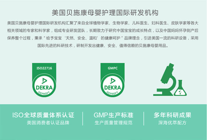 研發(fā)背景:來(lái)自美國(guó)科研團(tuán)隊(duì)的嚴(yán)苛負(fù)責(zé)全線產(chǎn)品均遵循國(guó)際生產(chǎn)標(biāo)準(zhǔn) 給予寶寶安全舒適的呵護(hù) 美國(guó)貝施康母嬰護(hù)理國(guó)際研發(fā)機(jī)構(gòu)匯聚了來(lái)自全球植物學(xué)家、生物學(xué)家、兒科醫(yī)生、婦科醫(yī)生、皮膚學(xué)家等各大相關(guān)領(lǐng)域的專(zhuān)家和科學(xué)家,組成專(zhuān)業(yè)研發(fā)團(tuán)隊(duì),長(zhǎng)期致力于研究中國(guó)寶寶的成長(zhǎng)特點(diǎn),以及中國(guó)媽媽?xiě)言械疆a(chǎn)后保養(yǎng)整個(gè)過(guò)程,秉承“給予寶寶‘天然、安全、溫和’的健康呵護(hù)”品牌理念,引進(jìn)美國(guó)一流的科研設(shè)備,采用國(guó)際先進(jìn)的科研技術(shù),研制開(kāi)發(fā)出健康、安全、值得信賴的貝施康母嬰用品。