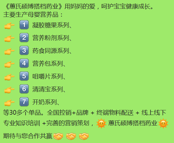 主要生產(chǎn)母嬰營養(yǎng)品∶凝膠糖果系列、營養(yǎng)粉劑系列、藥食同源系列、營養(yǎng)包系列、咀嚼片系列、清清寶系列、開奶系列、等30多個(gè)單品。全國控銷+品牌+終端物料配送+線上線下專業(yè)知識(shí)培訓(xùn)+完善的營銷策劃,焱蕙氏碩博搭檔藥業(yè)燃期待與您合作共贏