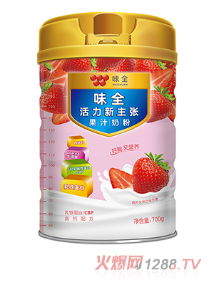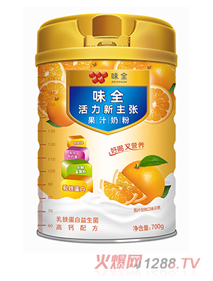 味全活力新主張果汁奶粉,精選奶源,嚴選產地,鮮奶投入,采用先進濕法工藝制作,營養(yǎng)鮮活豐富。添加乳鐵蛋白益生菌高鈣配方,自帶天生抵御力,為成長構筑健康防線。