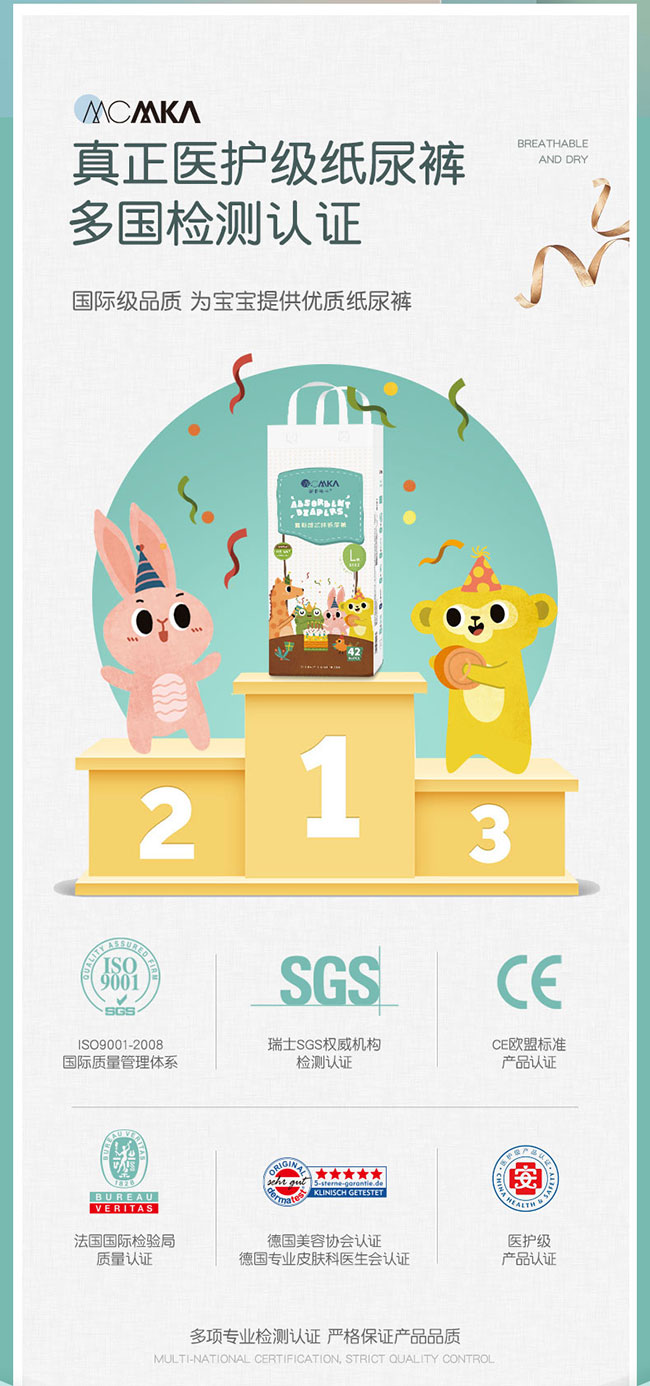 麥卡米卡暢氧超芯體學步褲,第4代“超芯”,更薄、更快、更干爽、更安全!獨創(chuàng)芯體U型槽,吸收更快,更大容量;超聲波壓合云朵凸點面層,減少皮膚接觸面,遠離紅屁股;大環(huán)腰體貼腰圍,防漏不勒紅;立體雙層防漏,護圍拉伸自動外翻設計,有效防止側漏;0.1cm超薄芯,一片尿褲反鎖整夜尿量;臺灣進口面層,立體打孔,輕松吸收,迅速把干;醫(yī)護級紙尿褲,多國檢測認證,安全放心。