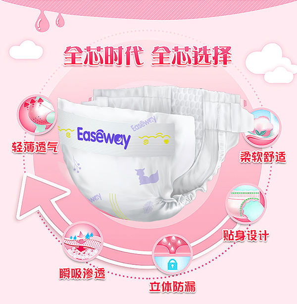 宜氏紙尿褲采用進口高分子薄型吸液芯體,搭配獨特凹槽設計,實現(xiàn)立體多維吸收,能倍量瞬吸,讓寶寶時刻保持干爽舒適。大吸量的設計,即使整夜使用也無需擔憂。速滲親柔面層,多維高效吸收,貼體綿彈環(huán)腰,采用科學無束裁剪,不僅穿著舒適,還能全方位貼合寶寶身體。雙層拒水防漏,加上 110mm 加寬芯體,雙倍瞬吸,并且不會斷層、起坨,一片就能使用 10 小時。加寬立體護圍防止側漏,柔軟立體護圍自動外翻,富有彈性,讓寶寶活動不受限制。