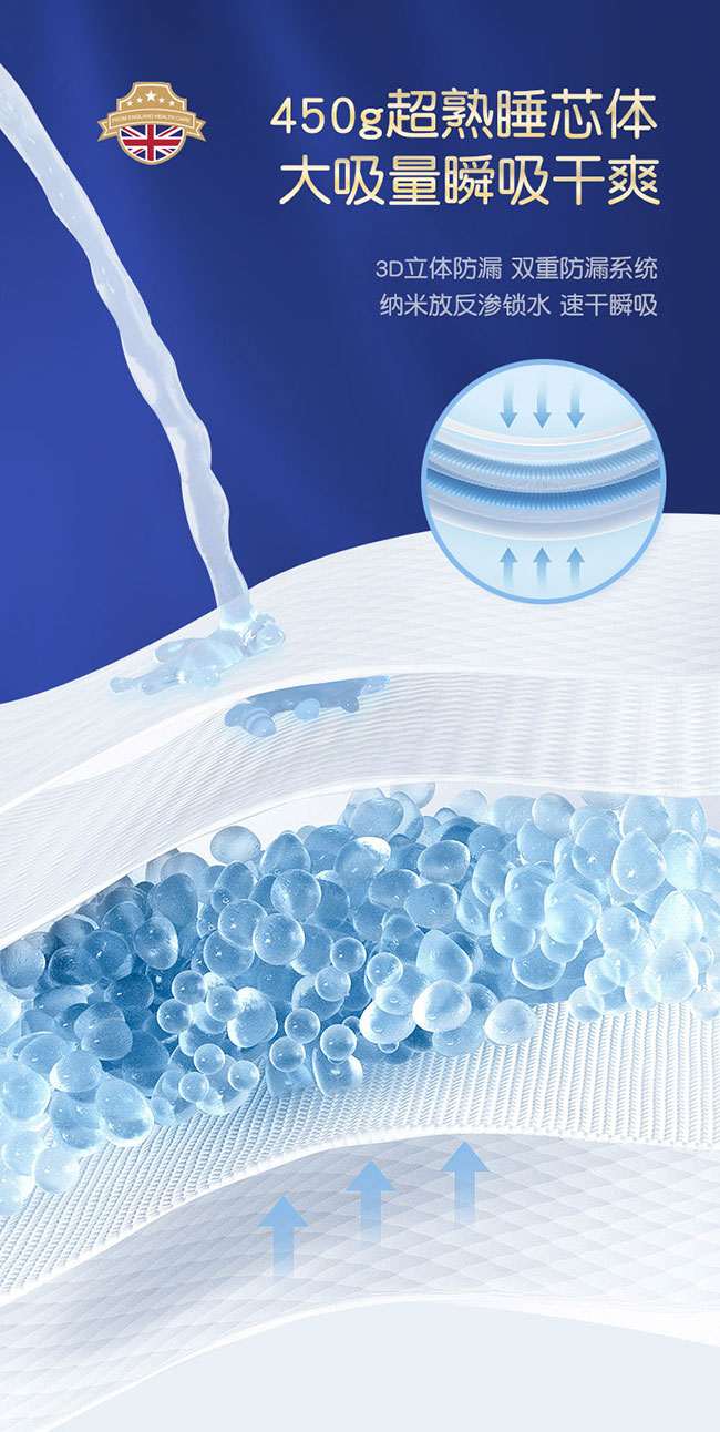 450g超熟睡芯體搭配第三代全芯體技術(shù),吸量與鎖水力雙在線(xiàn)。3D立體防漏與納米反滲系統(tǒng)形成雙重守護(hù),干爽狀態(tài)能持續(xù)12小時(shí),一夜一片,不打擾寶寶的安穩(wěn)睡眠。柔似蟬翼的質(zhì)感,讓寶寶穿著舒適自如,盡情探索世界。