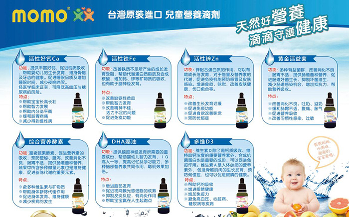 momo營養(yǎng)素滴劑系列,100%臺灣原罐原裝,正規(guī)進(jìn)口食品,安全有保障。臺灣專業(yè)研發(fā)團(tuán)隊(duì),采用本土原材料,采用嚴(yán)格的自我生產(chǎn)管理系統(tǒng),從 產(chǎn)品開發(fā)、原來生產(chǎn)到末端產(chǎn)品的包裝,提供完整的品質(zhì)服務(wù),F(xiàn)正面向全國招商中,有意向者現(xiàn)在就可以通過火爆嬰童網(wǎng)進(jìn)行留言咨詢。
