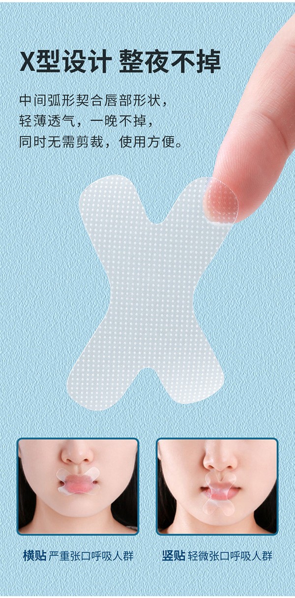閉口貼,X型設(shè)計(jì),整夜不掉,中間弧形契合唇部形狀,輕薄透氣,一晚不掉,同時(shí)無需剪裁,使用方便。輕薄透氣不悶汗,拒絕口呼吸,讓你每夜安眠;溫和剝離,不留殘膠,敏感肌可用,清潔安心。
