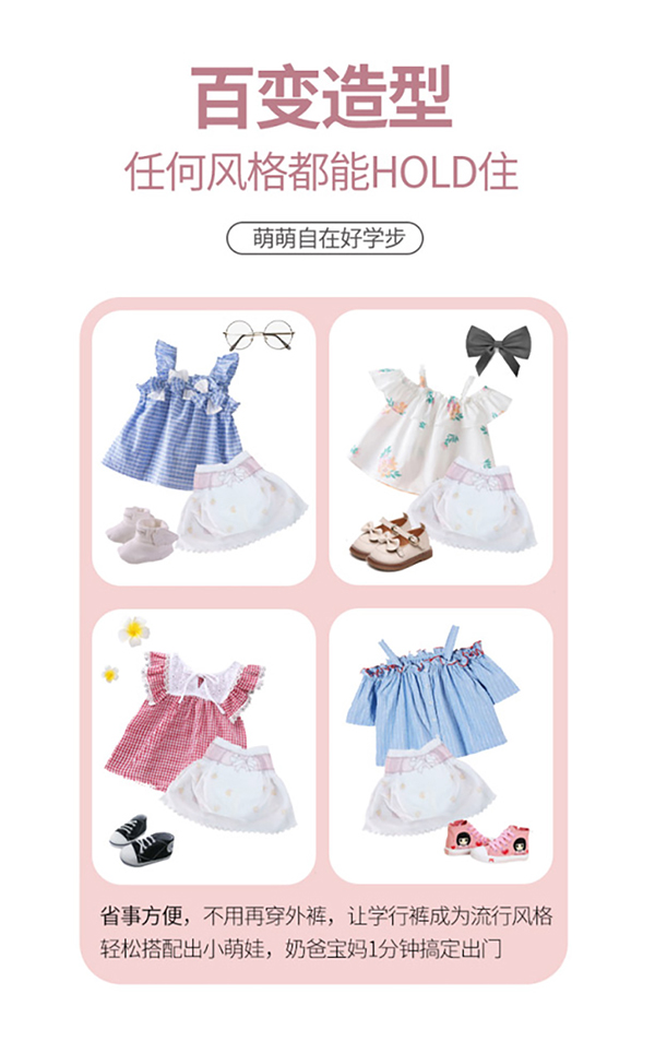 1、尿褲+外裙一體設(shè)計(jì),省去頻繁穿脫裙子的麻煩