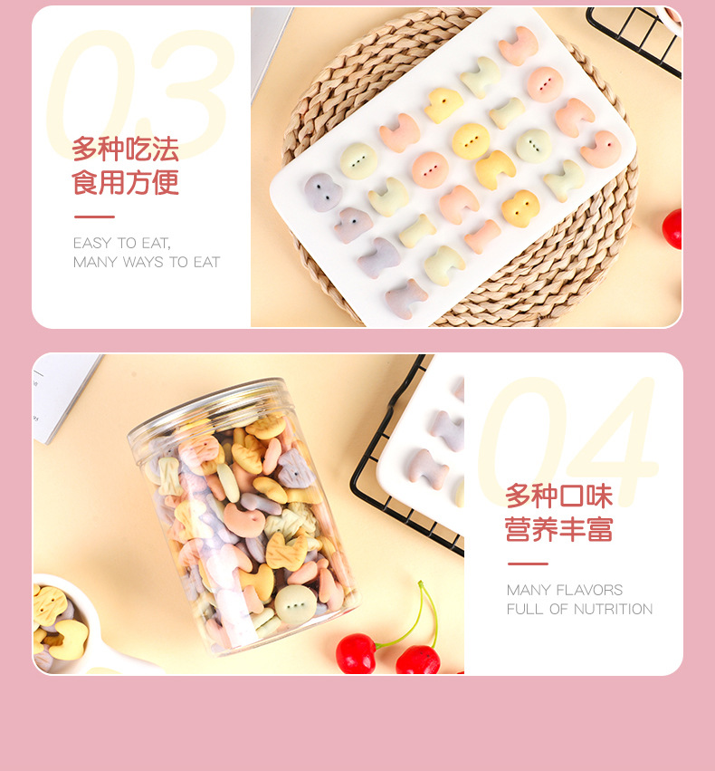 口味貼牌定制雞內(nèi)金果蔬餅干兒童食品數(shù)字造型餅干源頭工廠加工產(chǎn)品展示