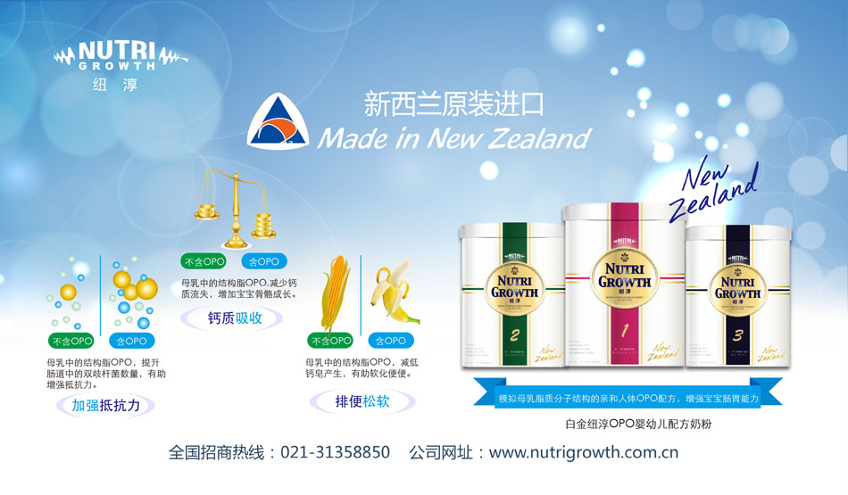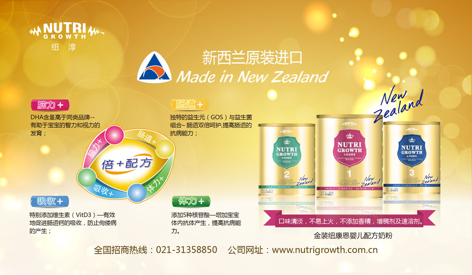 為使中國(guó)寶寶也能享受到NUTRI GROWTH NEW ZEALAND LIMITD(紐淳)的關(guān)愛(ài),2008年NUTRI GROWTH 正式進(jìn)軍中國(guó)市場(chǎng),2009年金裝“紐康恩”嬰幼兒配方奶粉全線上市。