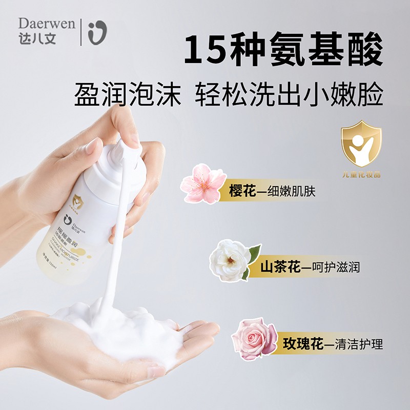 達兒文搖搖盈潤潔面慕斯,15種氨基酸,盈潤泡沫,洗出小嫩臉。櫻花細嫩肌膚,山茶花呵護滋潤,玫瑰花清潔護理。弱酸性配方,更接近皮膚pH值。