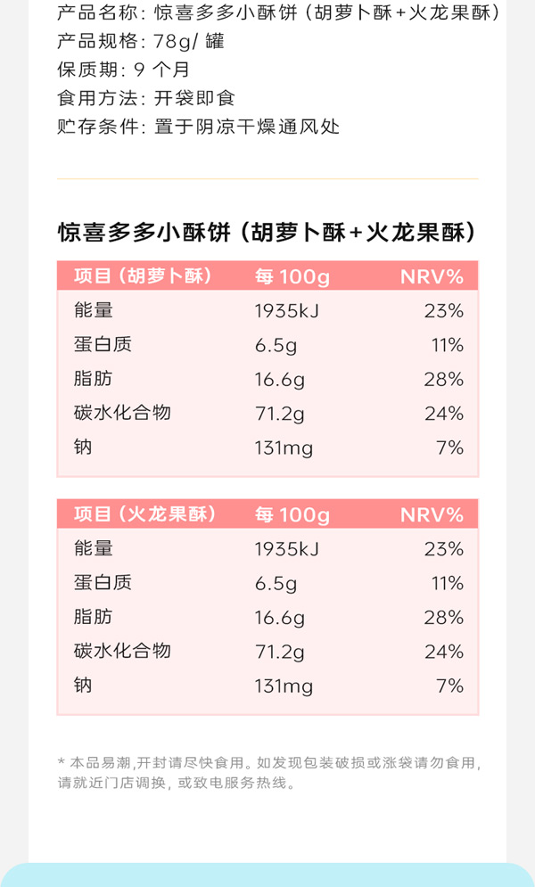 藍貝多多驚喜多多小酥餅(胡蘿卜酥+火龍果酥)添加胡蘿卜&火龍果,拒絕多余添加,雙拼口味,雙重滿足,低溫烘焙, 非油炸,保留食材中的營養(yǎng)成分,鎖住食材色香味,海藻糖更益牙,不會引起齲齒,獨立小包,定時定量。