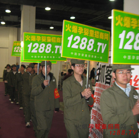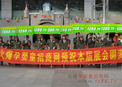 我們火爆孕嬰童穿上我們標志性服裝,身穿紅衛(wèi)兵綠色軍裝,頭戴火爆字樣綠色軍帽,左臂佩戴紅色火爆字樣袖章,高舉火爆孕嬰童招商網(wǎng),1288.tv字樣的宣傳牌吸引了所有參展人員的目光。